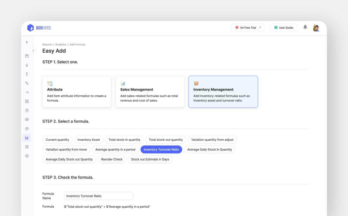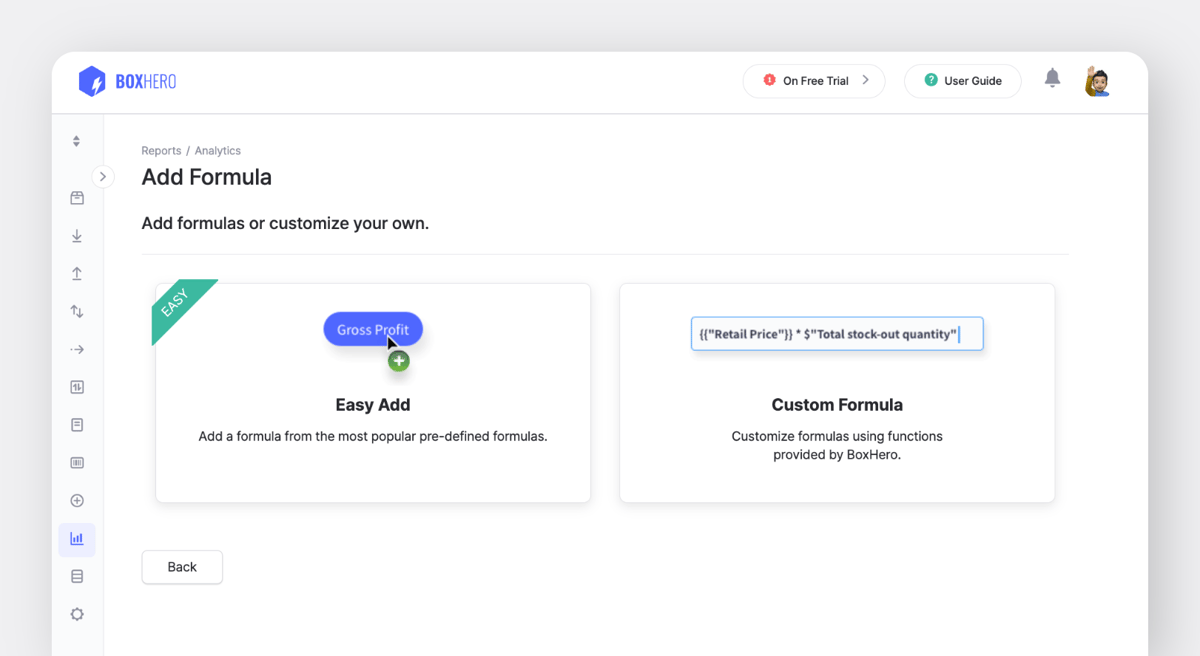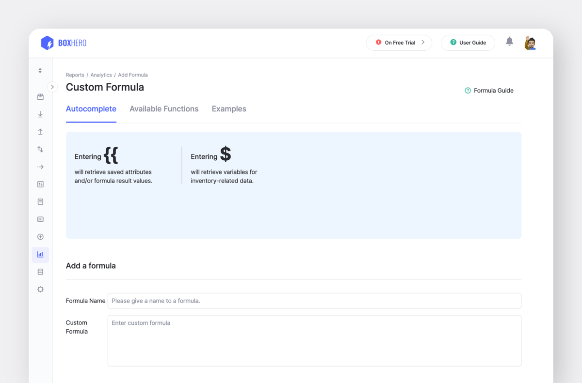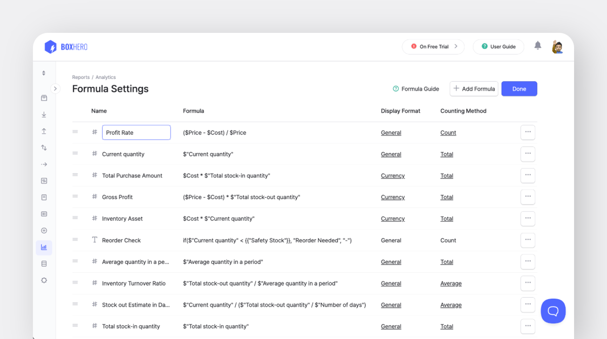 If you need to track something specific, BoxHero lets you build your own formulas. The formula editor works a lot like Excel, using basic math symbols and easy functions.