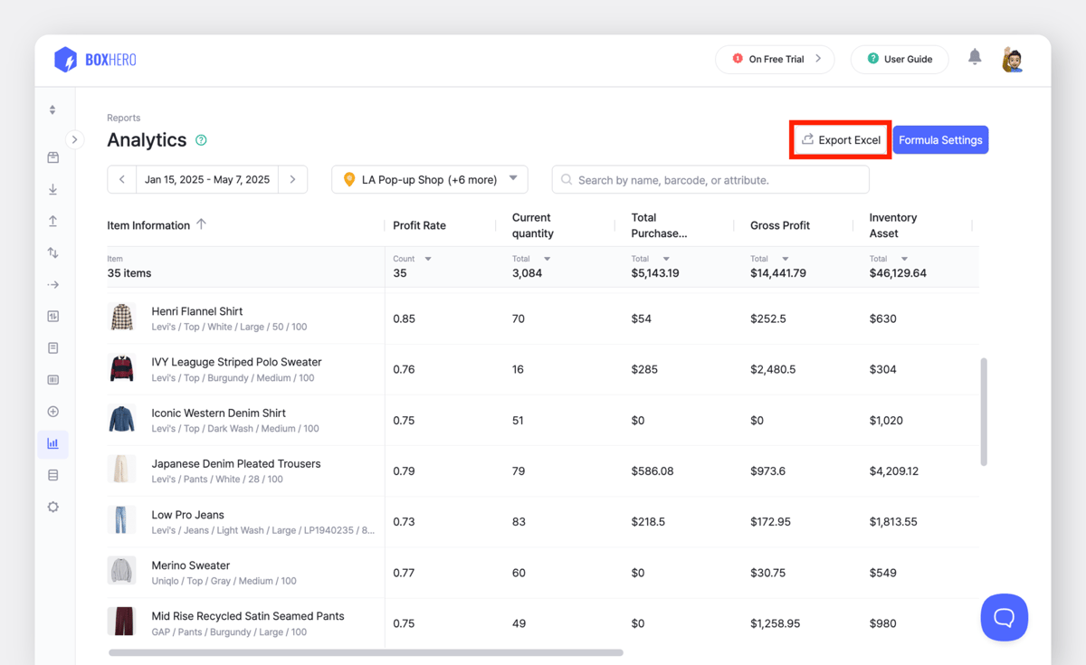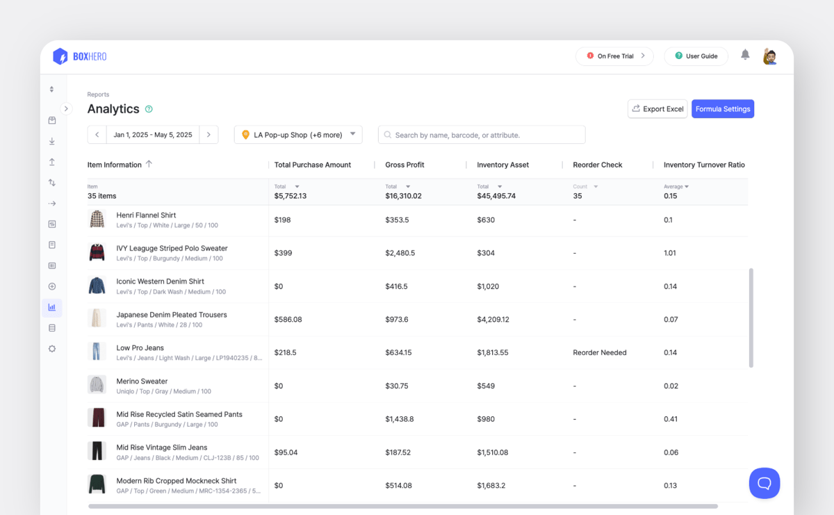 BoxHero’s Analytics feature helps you stay on top of your inventory and sales. Whether you use the ready-made formulas or create your own, it’s a simple way to keep track of the numbers that matter to your business.