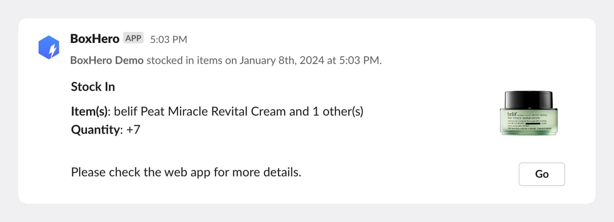 Through the Slack integration feature, you can now instantly view the stock in/stock out events created in BoxHero directly on Slack.