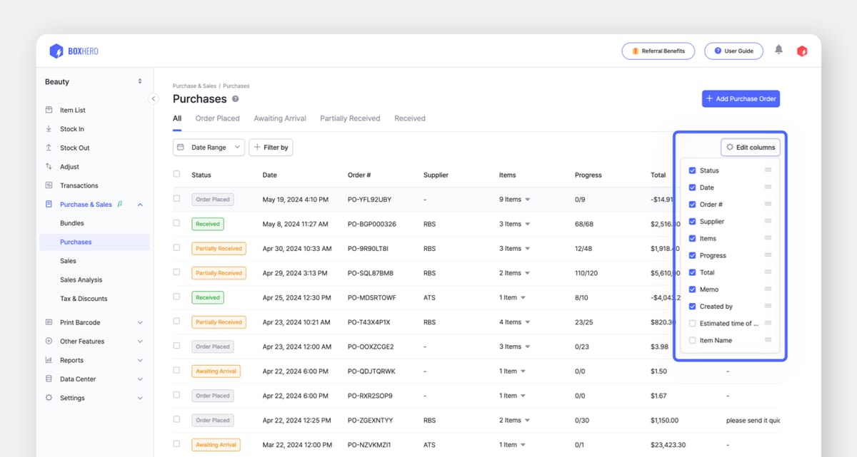 The BoxHero Team has made improvements to the Purchases & Sales menu so that you can now select which details are to be shown on your screen.