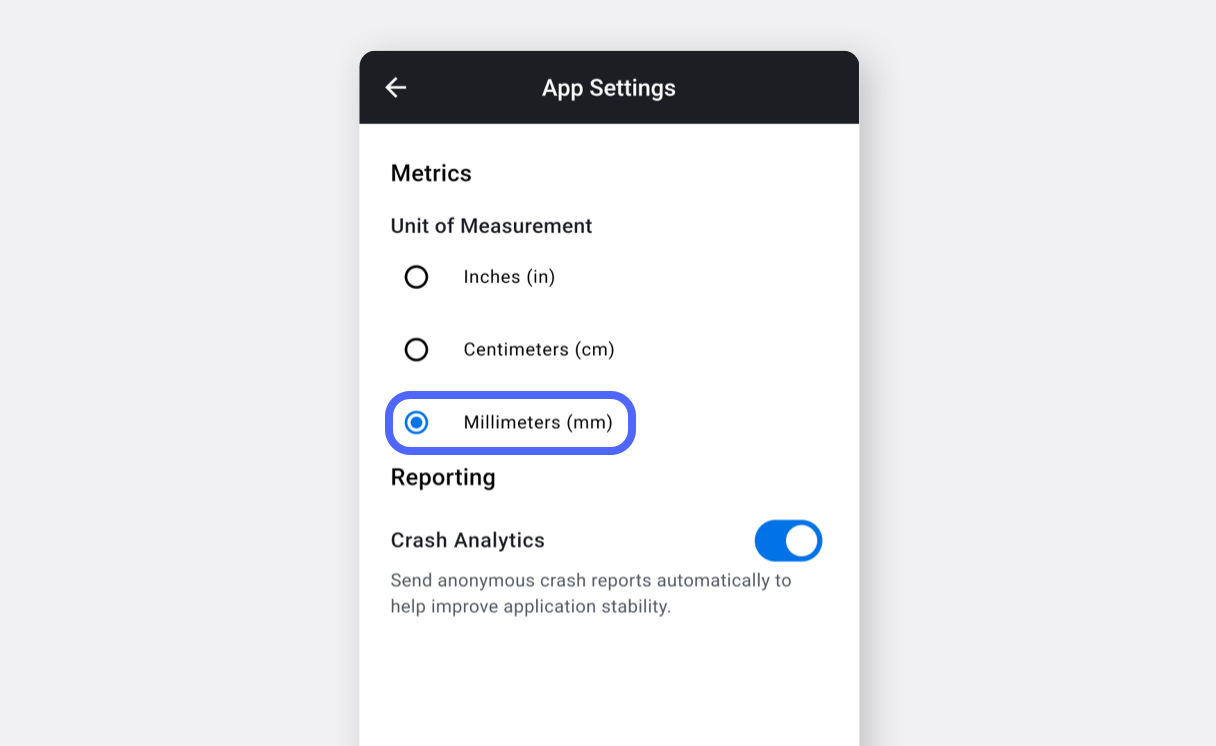 Cambia l'unità di misura in **millimetri (mm)** e torna alla schermata precedente.