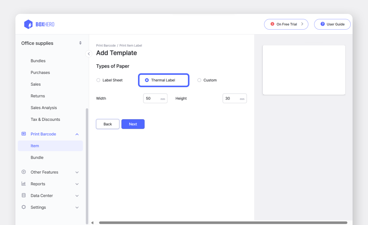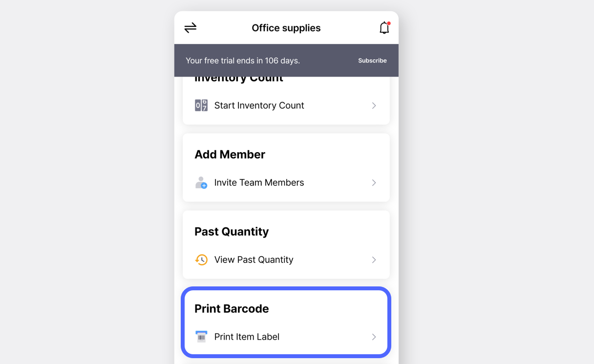BoxHero [sul tuo dispositivo mobile e tocca](https://docs-en.boxhero.io/getting-started#get-the-mobile-app) Stampa codice a barre **`nella schermata iniziale.`** Seleziona etichetta