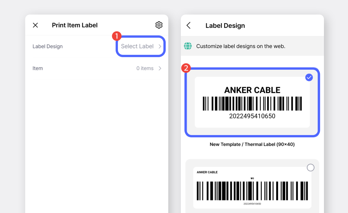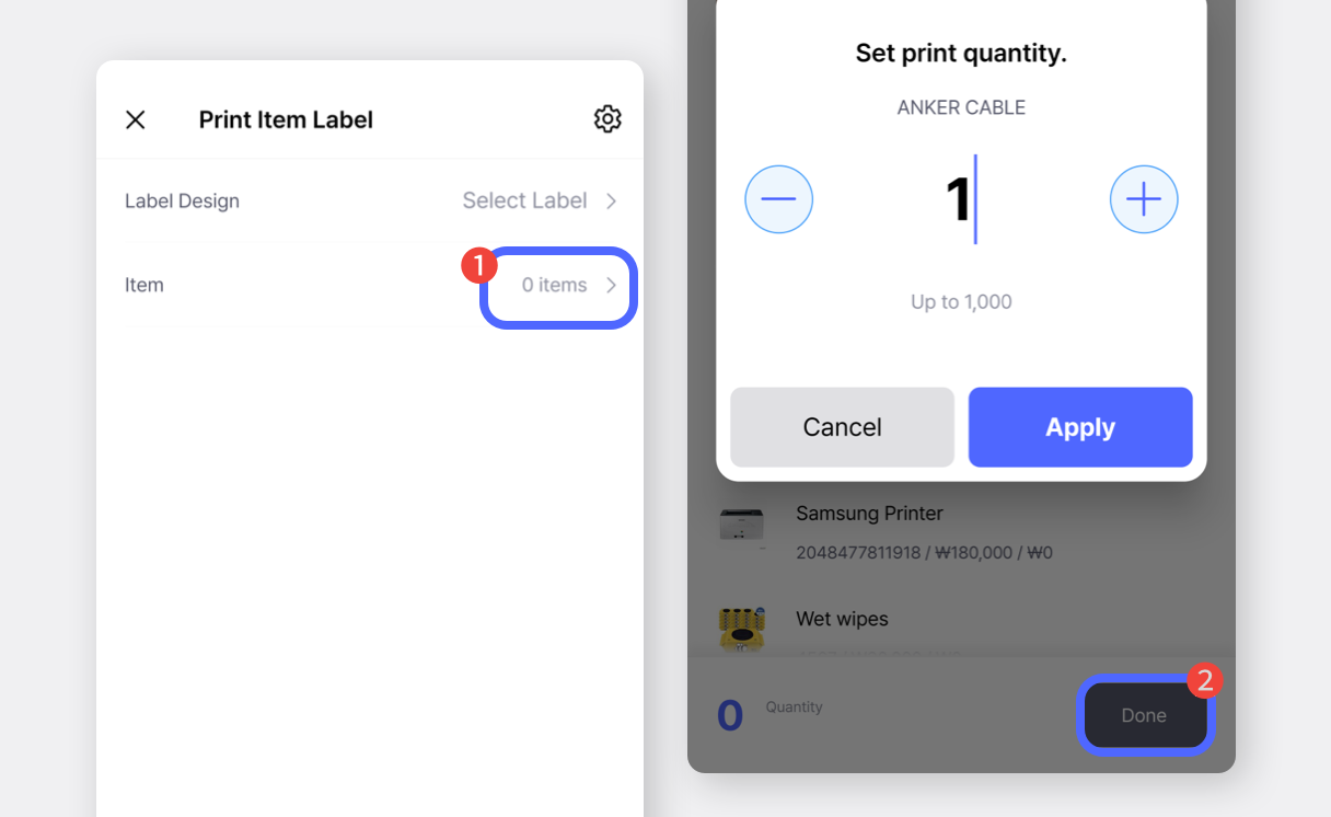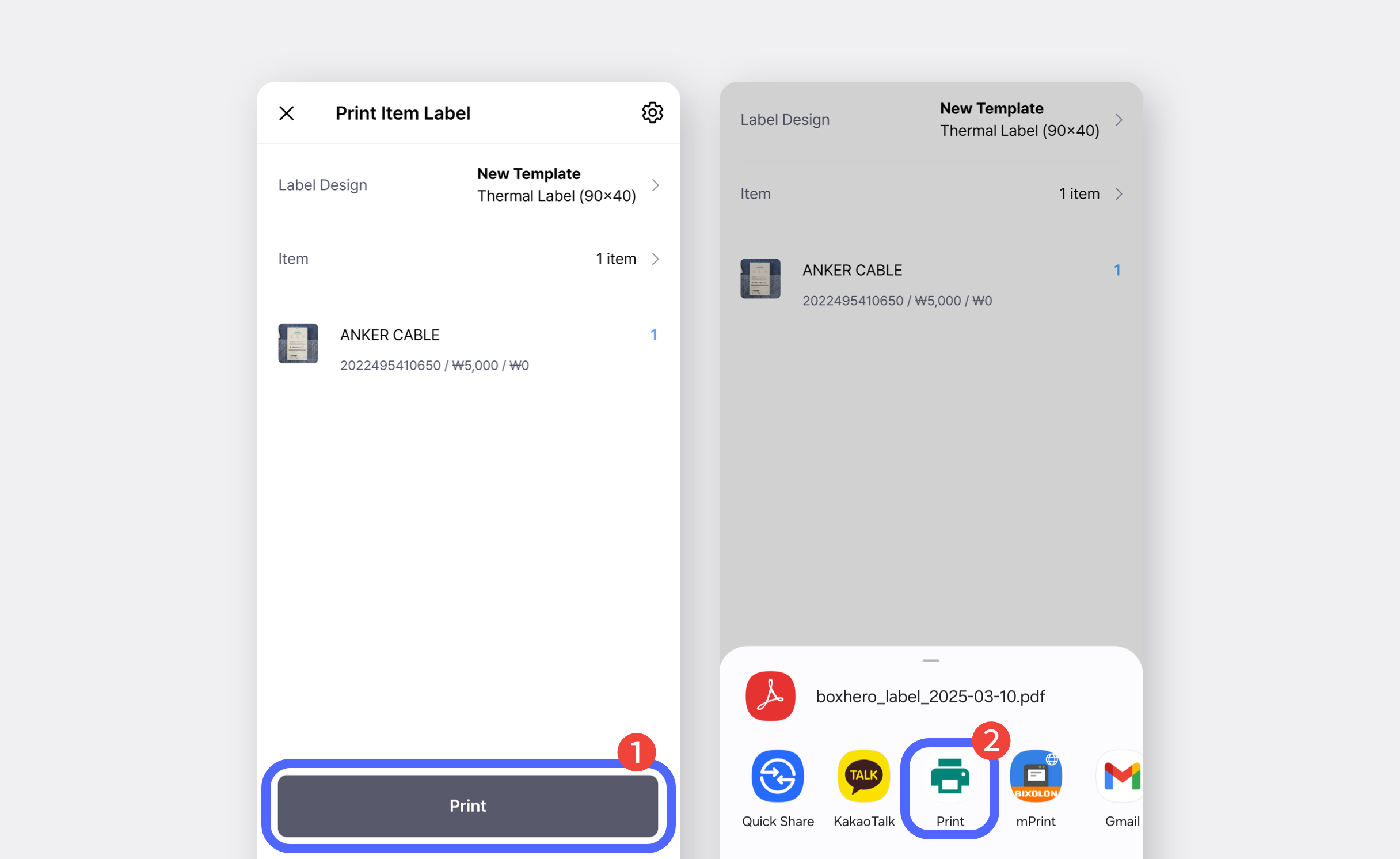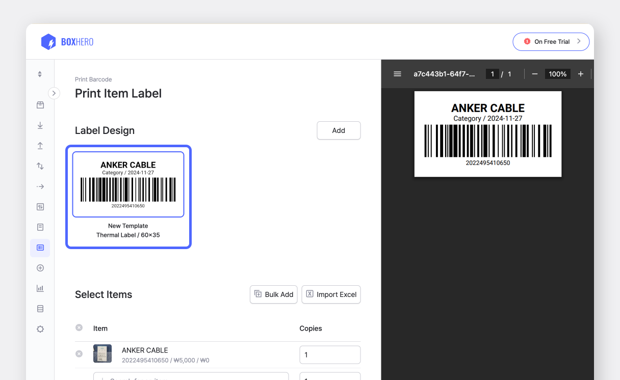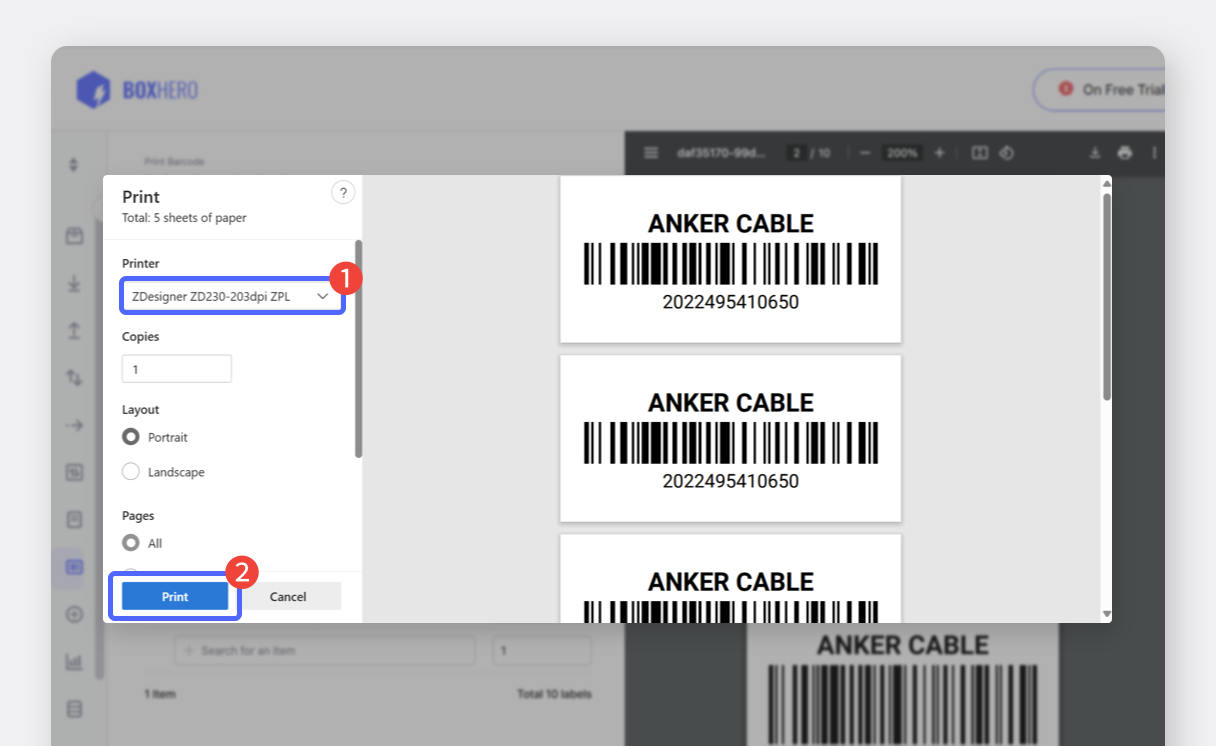 Una volta che l'app è configurata, puoi stampare etichette da **Zebra Print** BoxHero **Crea etichette con codice a barre sulla piattaforma web**.