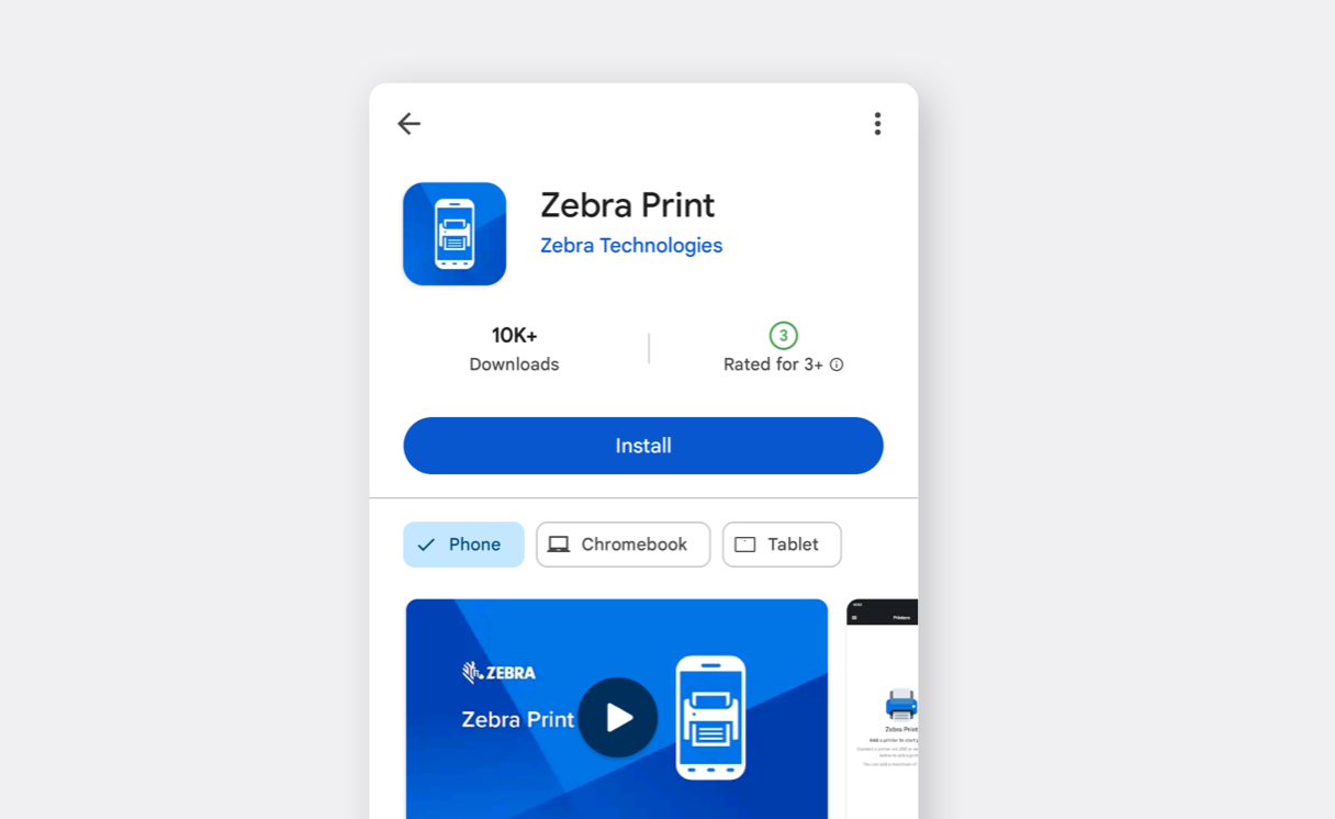 Installa [Zebra Print](https://play.google.com/store/apps/details?id=com.zebra.channelaps\&utm_source=na_Med) dal Google Play Store.