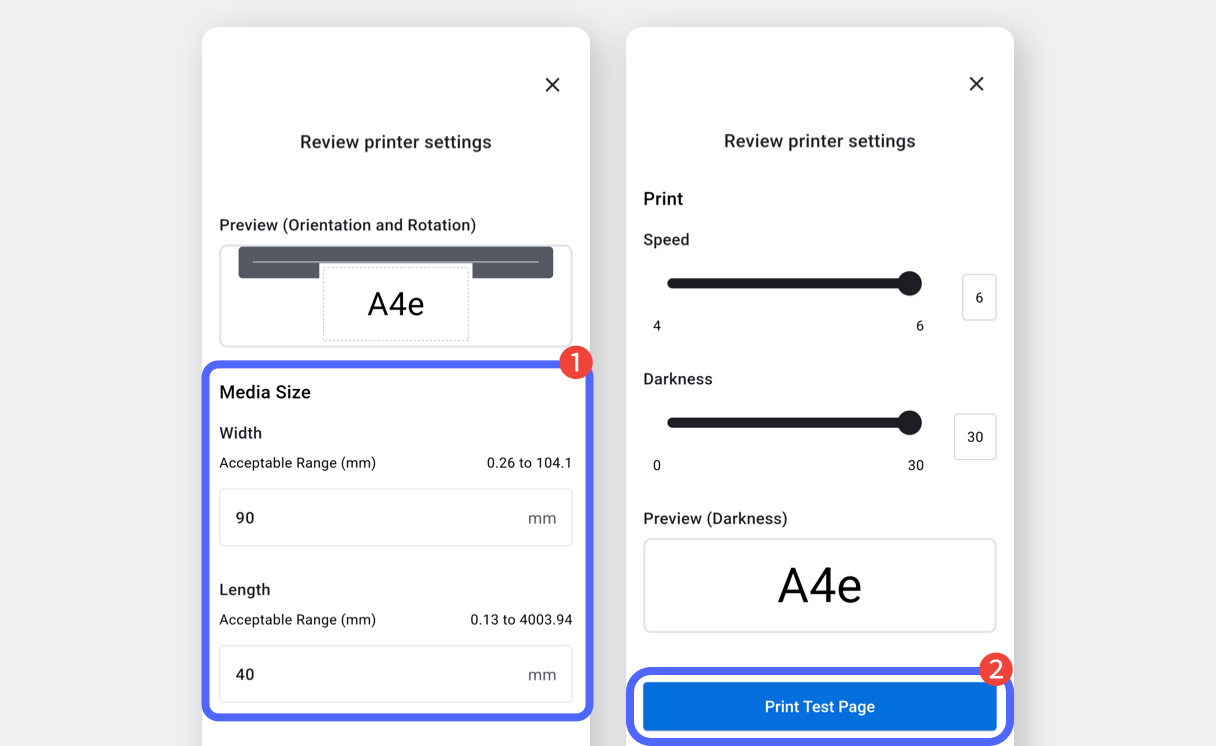 Inserisci la dimensione dell'etichetta e tocca **`Stampa pagina di prova`** per verificare l'output dell'etichetta.