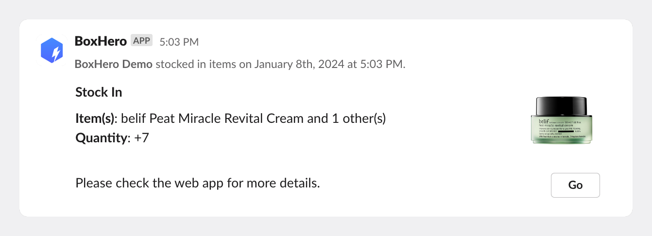 <figure><img src="https://823884625-files.gitbook.io/~/files/v0/b/gitbook-x-prod.appspot.com/o/spaces%2FlRf1QqJGoevCQqGbfI80%2Fuploads%2Fgit-blob-4fad8440cbf4542f9b82ed07be12e2003469bccf%2F%E1%84%89%E1%85%B3%E1%86%AF%E1%84%85%E1%85%A2%E1%86%A8%20%E1%84%86%E1%85%A6%E1%84%89%E1%85%B5%E1%84%8C%E1%85%B5_en.png?alt=media" alt=""><figcaption><p>Slack チャンネルに表示された BoxHero 通知</p></figcaption></figure>