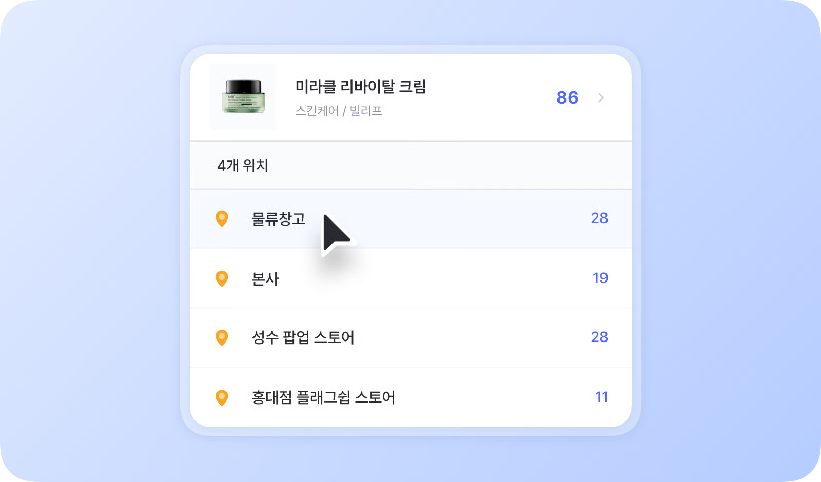 `제품목록`에서 제품을 선택하면 **전체 수량**과 **위치별 수량**을 한눈에 확인할 수 있습니다.