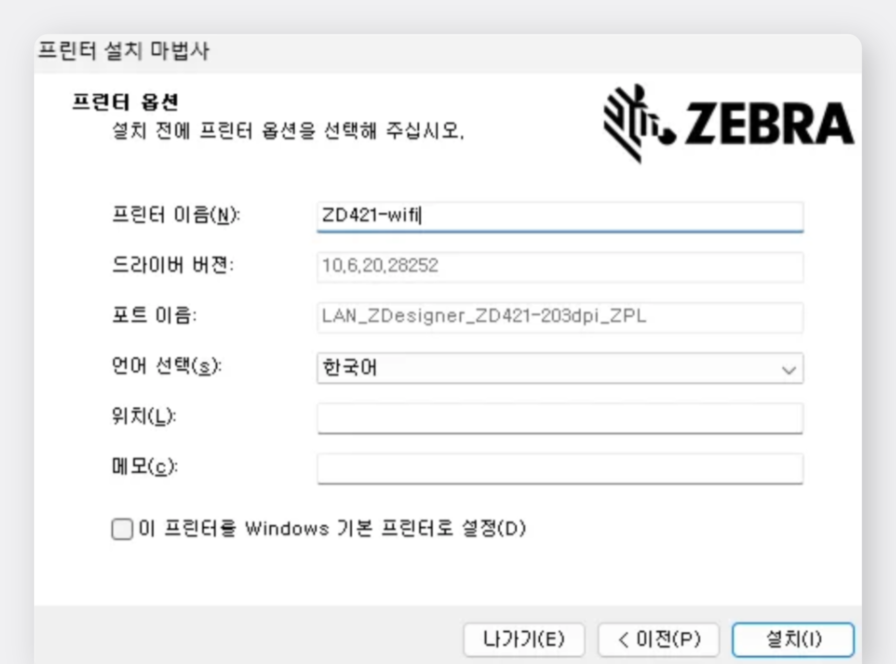 원하는 프린터 이름이 있다면 입력하고 `설치`버튼을 누릅니다.