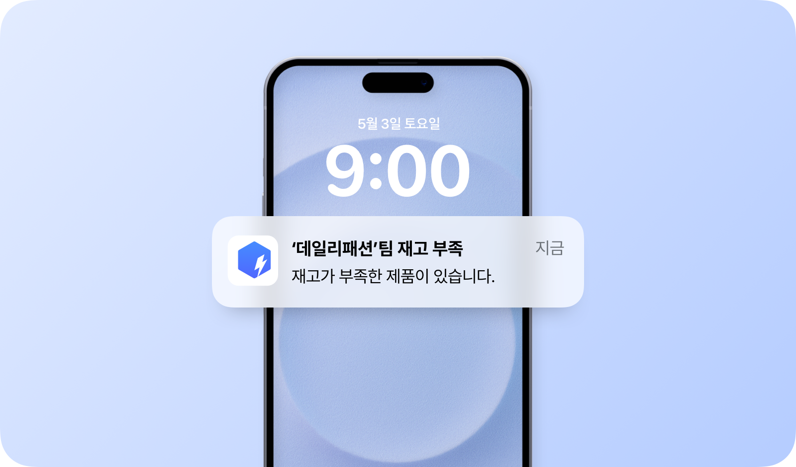재고 부족 알림을 설정하면 기본적으로 **모든 팀원**에게 모바일 앱 푸시 알림이 발송됩니다. 필요한 경우 `설정` > `알림 설정` 에서 유저별로 알림 조건을 설정할 수 있습니다.