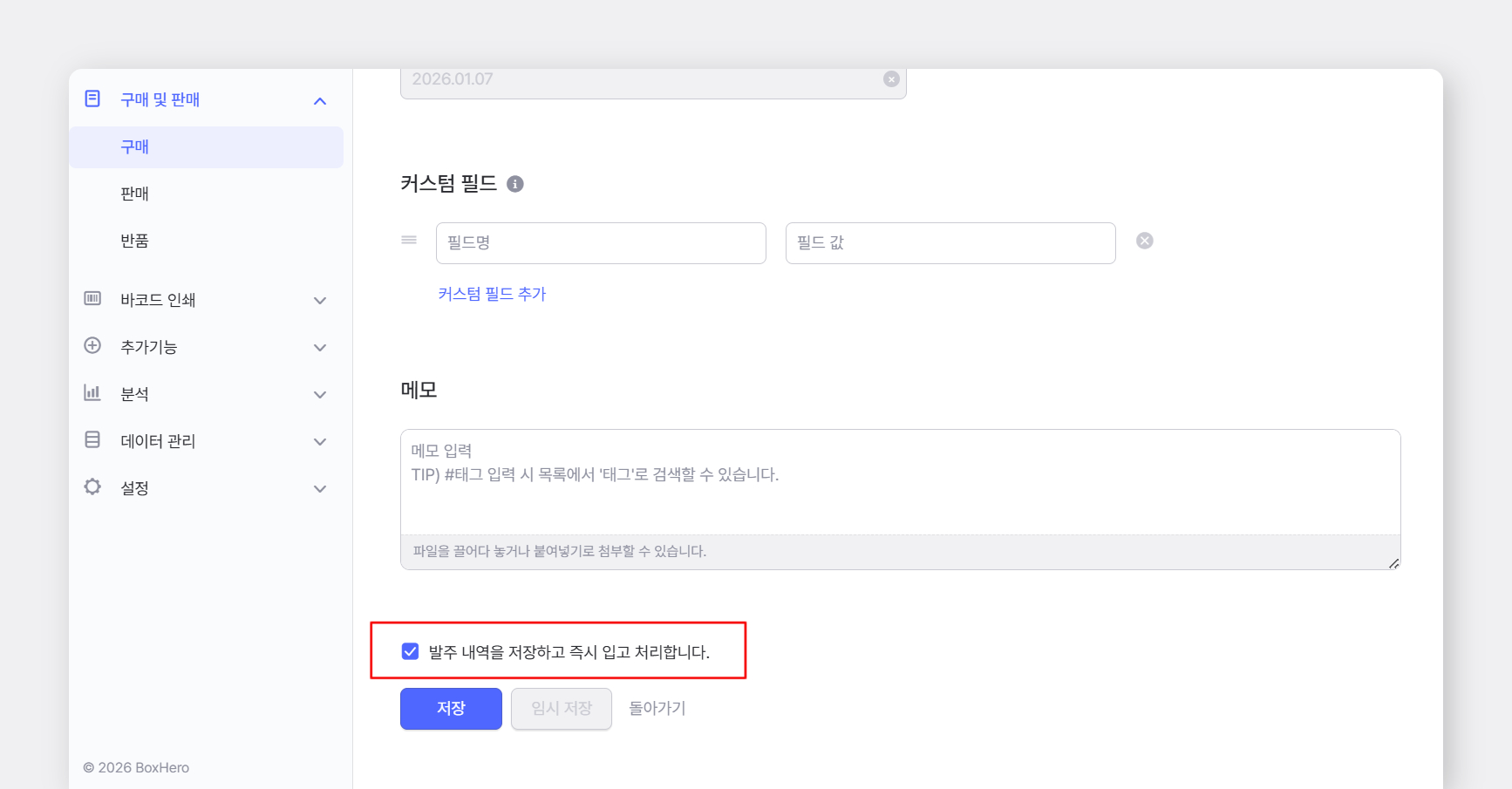 `임시 저장` 버튼을 누르면 재고에 즉시 반영하지 않고 임시로 목록을 저장할 수 있습니다.