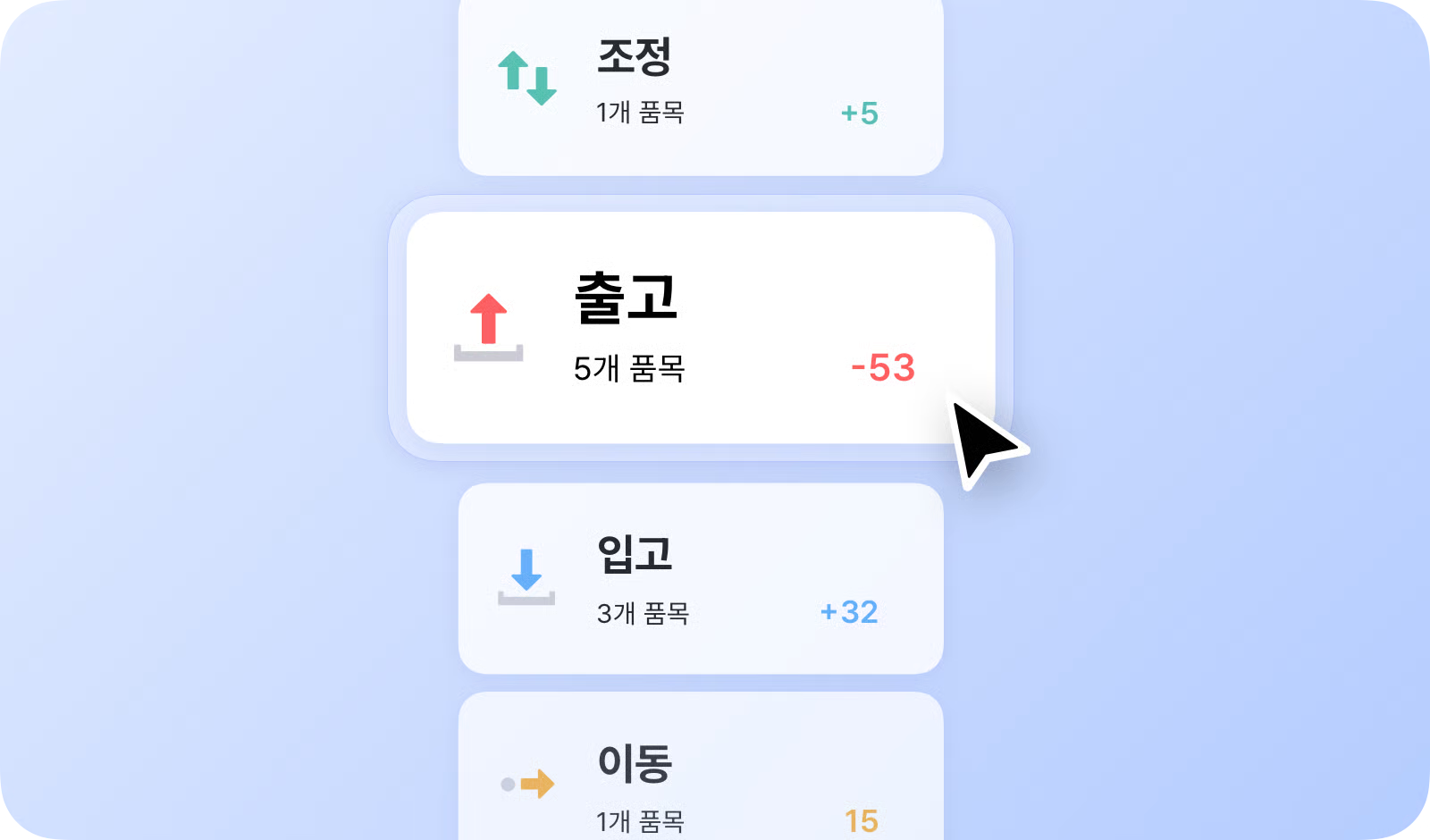 <table><thead><tr><th width="86.57159423828125">기능</th><th width="326.000244140625">설명</th><th>예시</th></tr></thead><tbody><tr><td><strong>입고</strong></td><td>입력한 수량만큼 재고가 <strong>증가</strong></td><td>수량 '5' 입력 → 재고가 +<strong>5 증가</strong></td></tr><tr><td><strong>출고</strong></td><td>입력한 수량만큼 재고가 <strong>감소</strong></td><td>수량 '5' 입력 → 재고가 <strong>-5 감소</strong></td></tr><tr><td><strong>조정</strong></td><td>현재 수량을 원하는 값으로 <strong>직접 변경</strong></td><td>수량 '60' 입력 → 재고가 <strong>'60'으로 변경</strong></td></tr><tr><td><strong>이동</strong></td><td>위치 간 수량을 이동</td><td><p>수량을 '10' 입력</p><p>→ 선택한 위치로 재고 <strong>'60'이 이동</strong></p></td></tr></tbody></table>