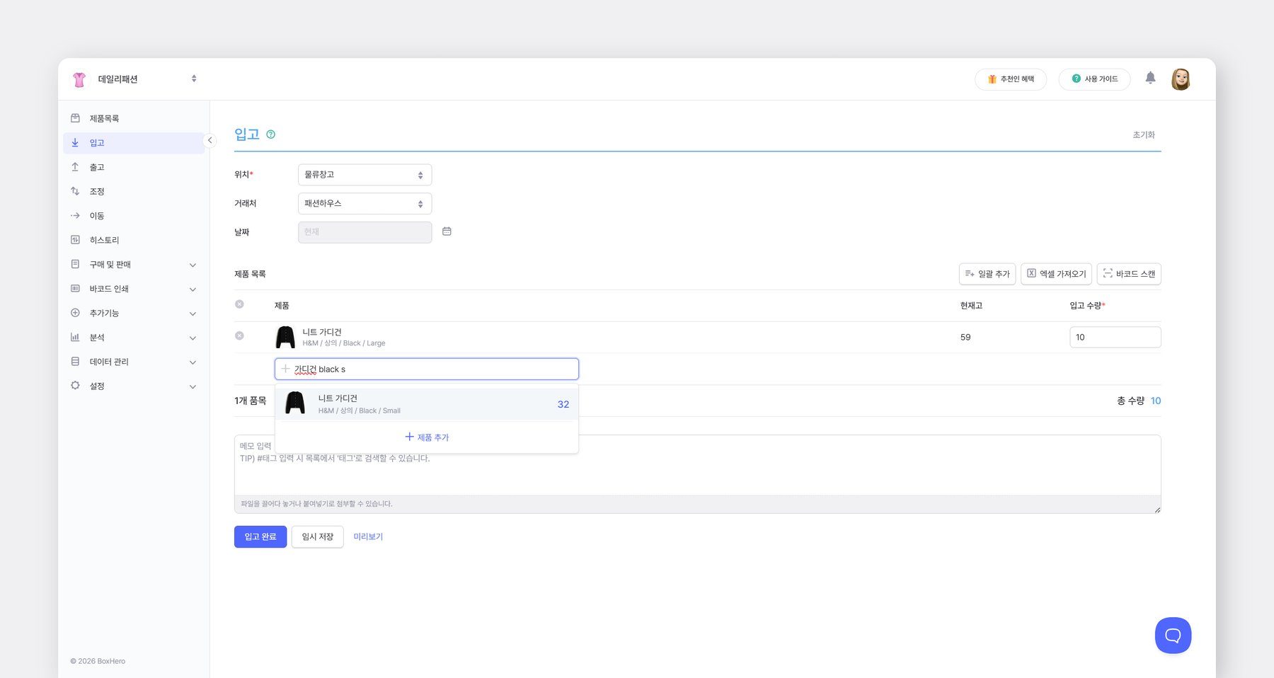 제품명이나 속성을 검색해 입출고할 [**제품**](https://www.boxhero.io/docs/documentation/ko/data-center/items)을 선택할 수 있습니다.