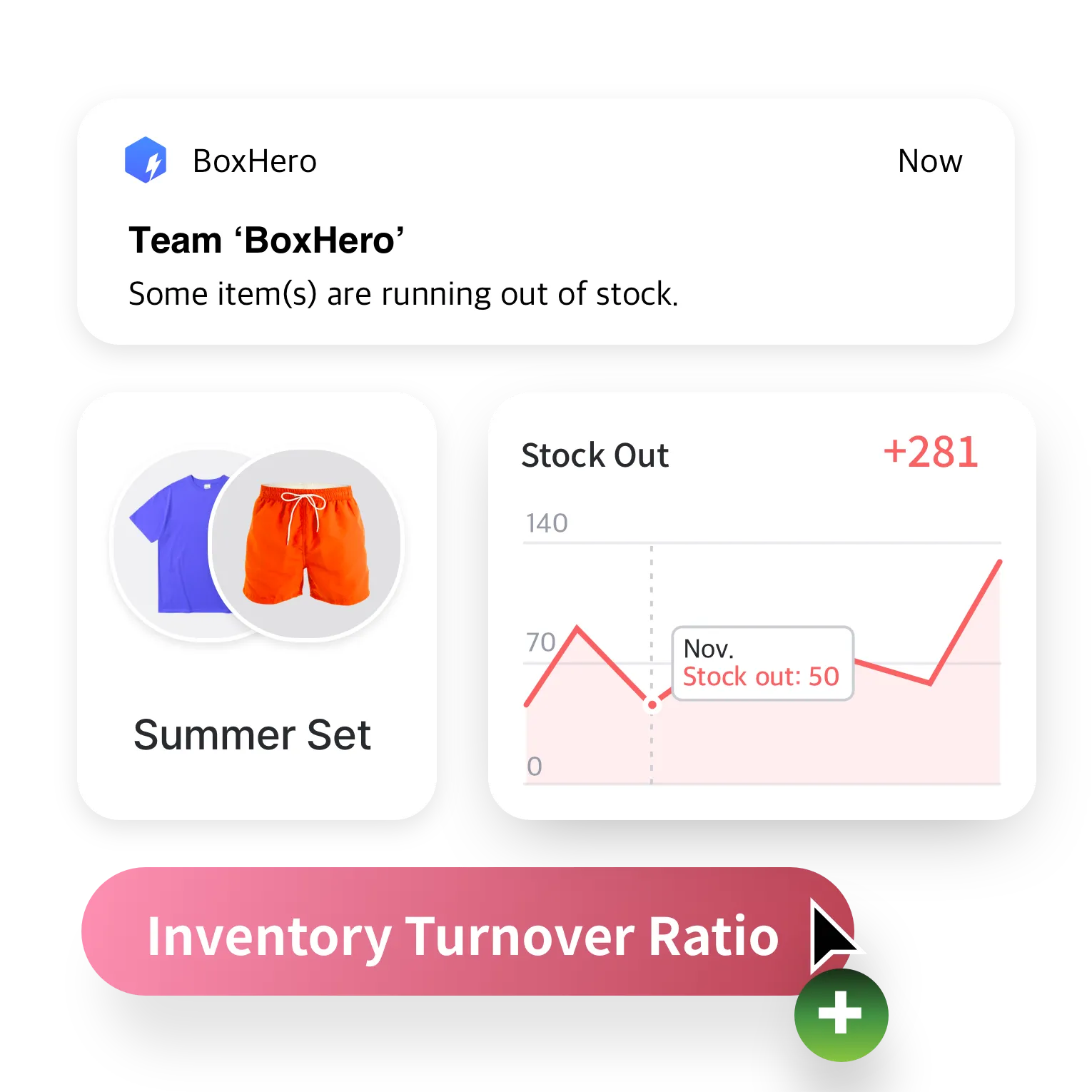 BoxHero provides advanced features like analytics, item bundling, and custom low stock alerts. You can get deeper insights into your inventory with our custom formulas for gross profit, inventory turnover ratio, and more—helping to make informed decisions for your business.