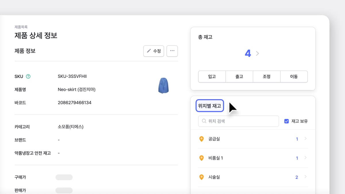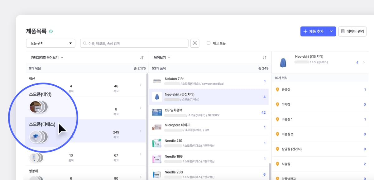 입고된 제품들은 주사실 약품장, 비품실, 공급실, 시술실, 채혈실, 약품 냉장고, 마약장 등 병원 내 여러 공간에 나누어 보관해요. 이러한 위치 정보는 박스히어로에도 동일하게 세팅되어 있어서, 언제 어디서나 재고 관리 솔루션만 열어봐도 각각의 공간에 어떤 약품이 몇 개 보관되어 있는지 한눈에 파악할 수 있죠.