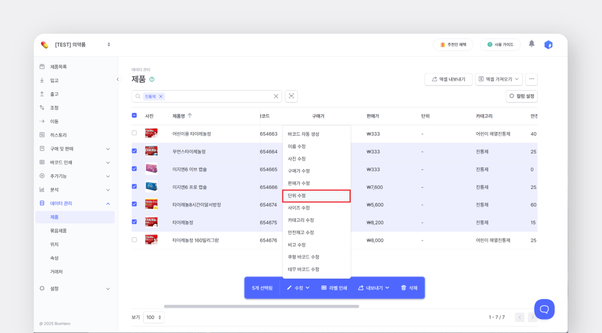 데이터 관리>제품에서 원하는 항목을 선택해 일괄 수정할 수 있어요.