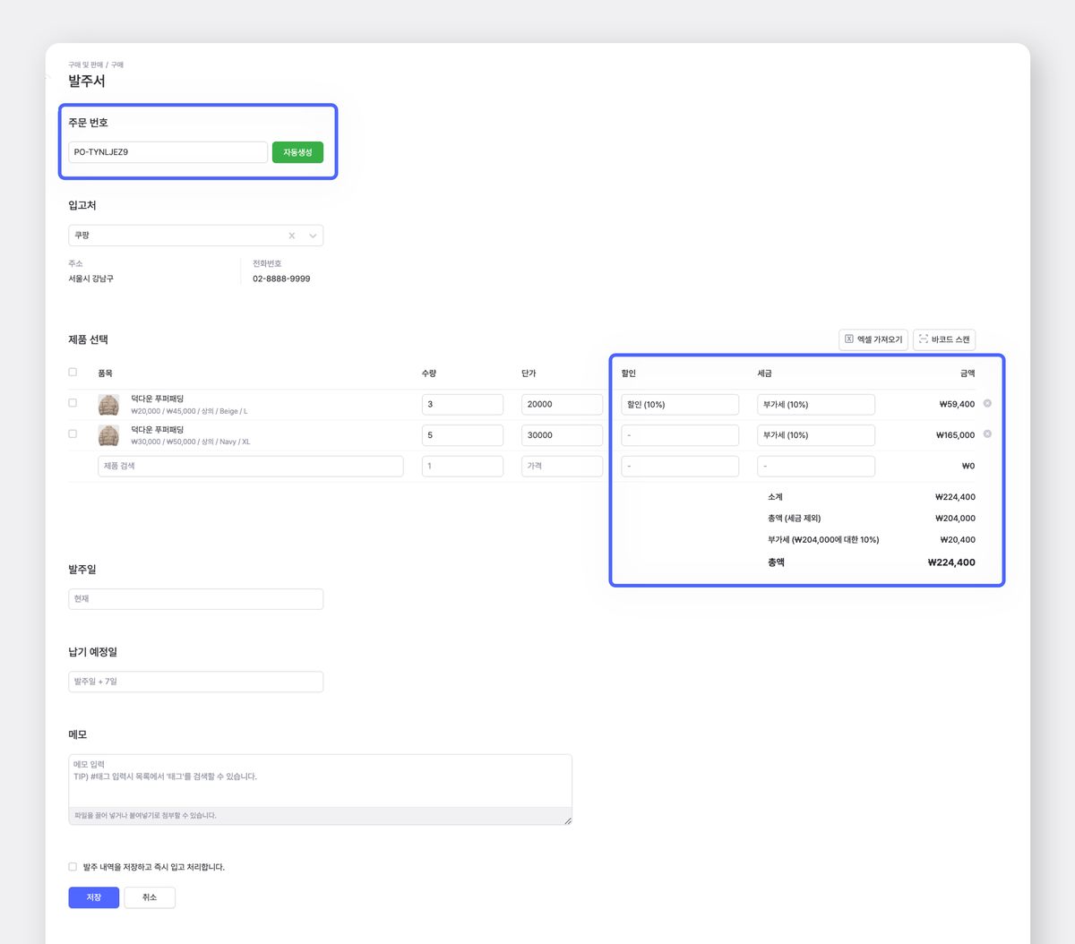 이제 발주, 판매서 작성시 세금과 할인을 적용할 수 있어요!