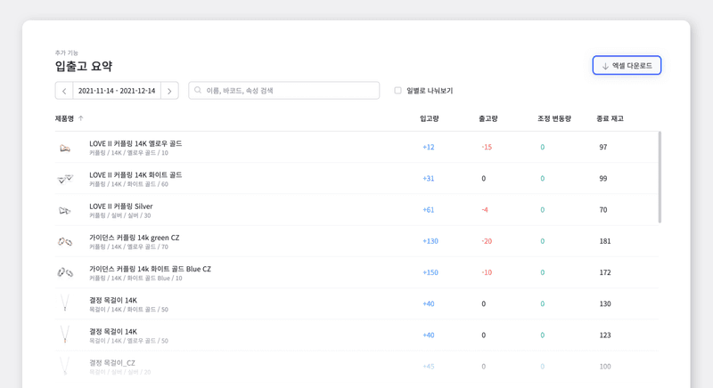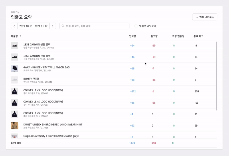 조회 기간을 설정 후, 일별로 나눠보기 메뉴를 클릭하면 해당 날짜의 입고/출고 및 조정 변동량, 종료 재고량까지 한 눈에 파악이 가능합니다.