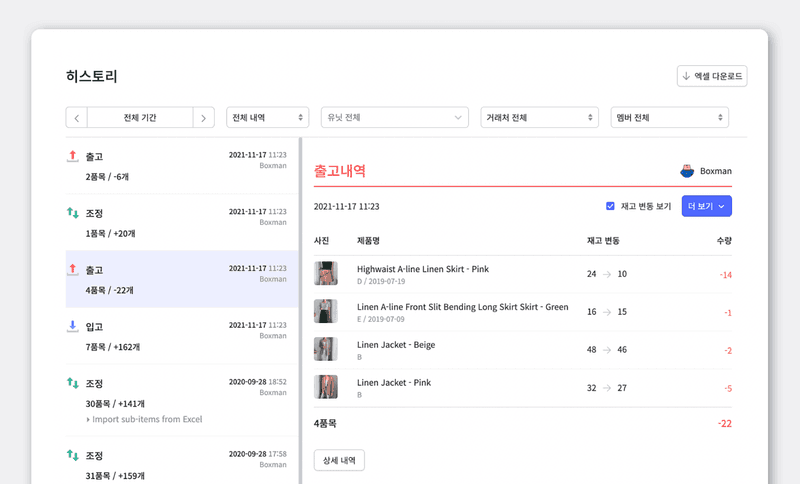 입출고 요약 기능에서는 특정 기간 동안의 입고량, 출고량, 조정 변동량 등을 제품 별로 요약해 한눈에 확인할 수 있습니다. 조회중인 자료를 외부로 전달해야 할 경우, 오른쪽 상단 엑셀 다운로드 버튼을 누르면 동일한 데이터를 엑셀 파일로 다운로드 받을 수 있습니다.