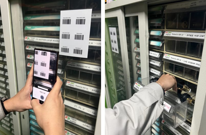 현장 직원들은 박스히어로 모바일 앱을 이용해 부품 박스의 바코드를 스캔하는 방식으로 비수불자재를 출고 후 사용해요. 중장년층도 어려움 없이 사용할 수 있을 정도로 모바일 앱이 직관적으로 구성되어 있기에 가능한 일이죠. 덕분에 생산팀은 모든 소모품과 공구를 한곳에서 체계적으로 관리할 수 있게 되었고, 이제는 안전재고를 통해 재고 부족도 미연에 방지하고 있어요. 재고 부족 알림이 뜨면 속성으로 입력해 둔 구매 품번을 주문 관리 시스템에 복사 - 붙여넣기하는 방식으로 발주 프로세스도 간소화했어요.