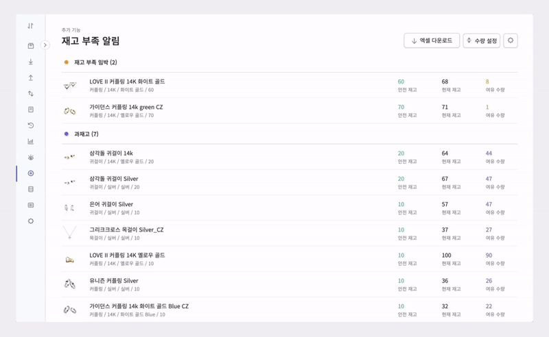 • 재고부족/재고부족 임박/과재고에 해당하는 제품 정보 리스트를 엑셀로 다운로드하실 수 있습니다.
