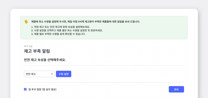 제품에 최소 수량을 설정해 두시면, 매일 아침 9시에 재고량이 부족한 제품들에 대한 알림을 보내드려요!
