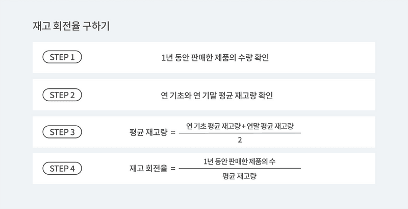 - 마지막으로 한 번의 기간 내 판매한 재고 수량을 평균 재고량으로 나눈 수가 바로 재고 회전율입니다.