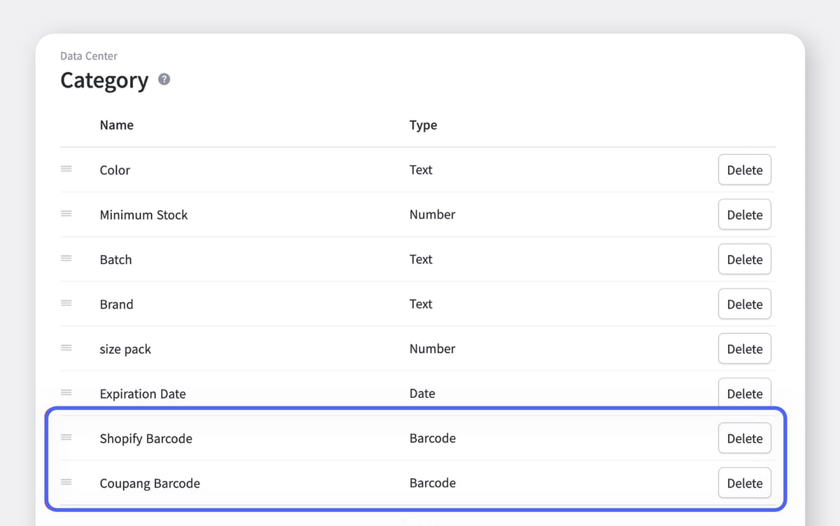 이런 경우, 먼저 박스히어로의 데이터 관리 > 속성 메뉴에서, "쇼피파이 바코드, 쿠팡 바코드"라는 이름으로 각기 다른 바코드를 생성 하여 제품 속성에 추가해 주세요.