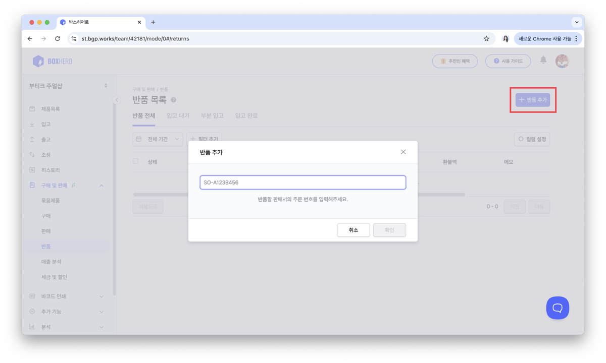 구매 및 판매 > 반품에서 우측반품 추가버튼을 클릭합니다.- 반품할 판매서의 주문 번호를 입력해 주세요.