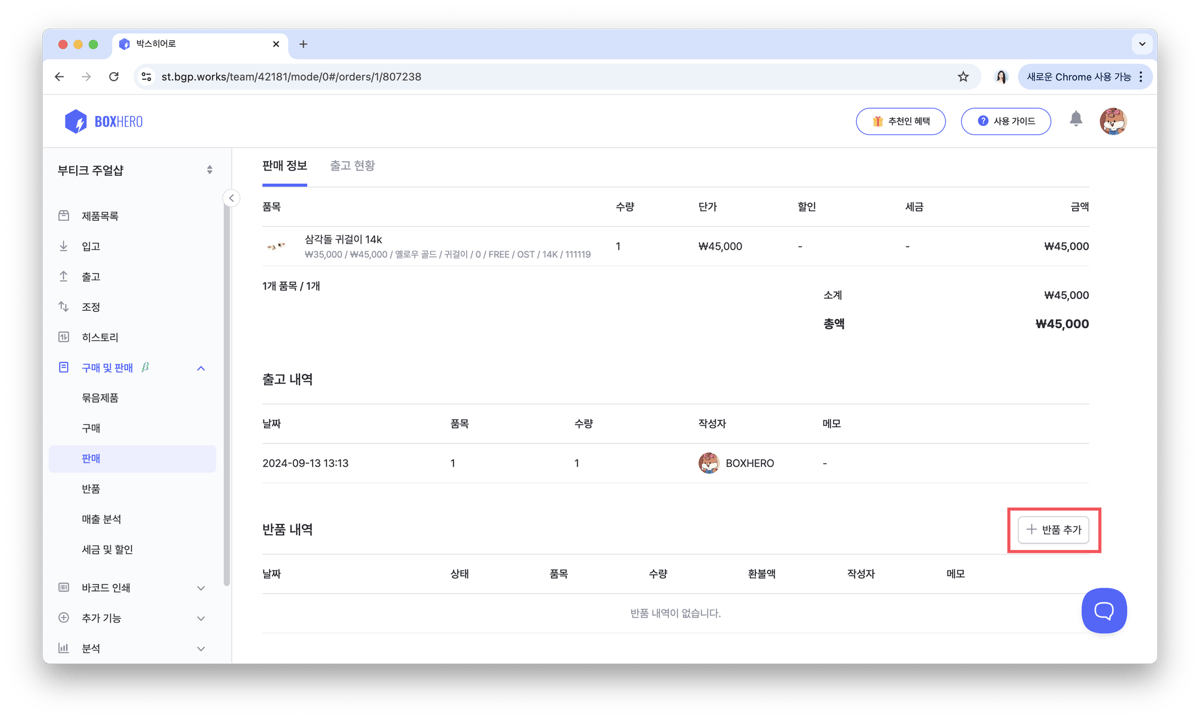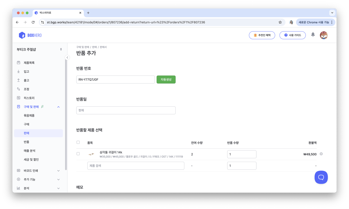 반품 추가 페이지로 이동하면 반품할 제품을 선택한 뒤 반품 수량을 입력해주세요. 환불액은 '판매 단가 x 반품 수량'으로 계산되어 자동 입력됩니다.