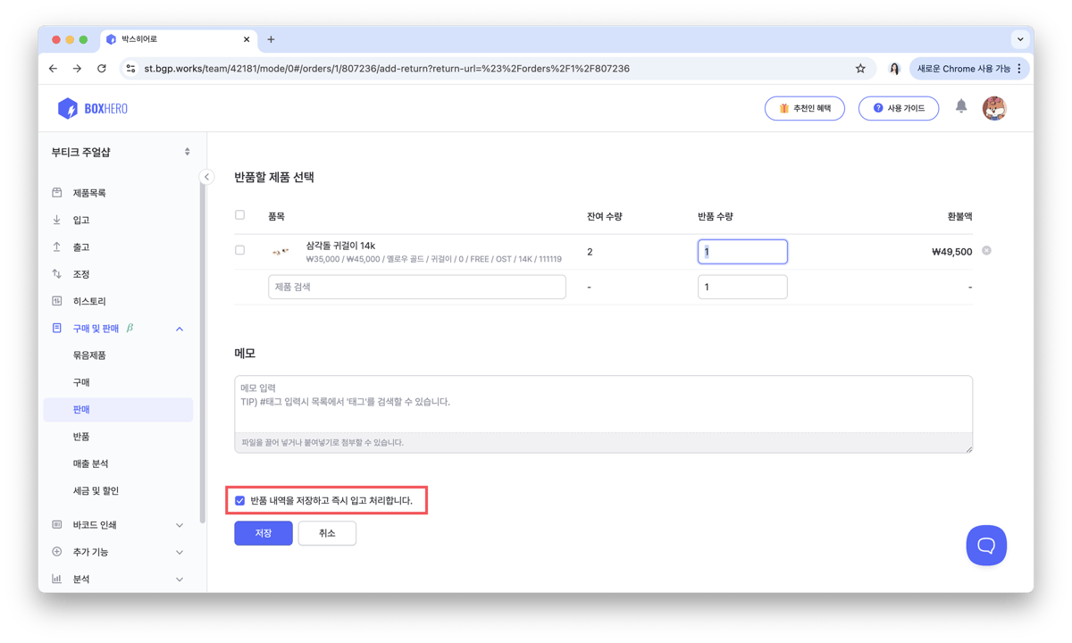 반품 제품이 이미 입고되었다면 하단의 "반품 내역을 저장하고 즉시 입고 처리합니다."를 선택한 후 저장해 주세요. 재고 수량에 즉시 반영 됩니다.